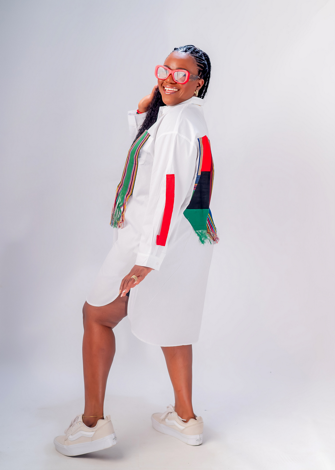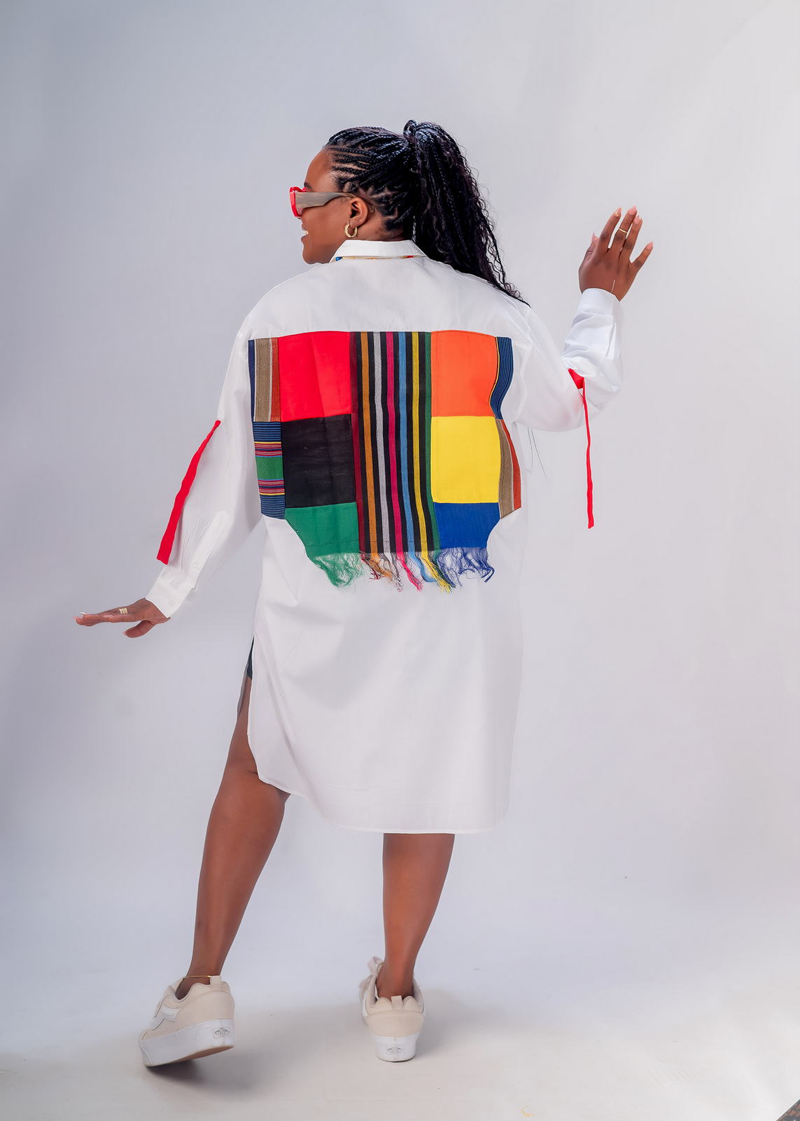 Ashake shirt dress is a versatile shirt dress designed with aso-oke for effortless style and comfort. Crafted from vibrant long Shirt fabric, it features a long front zipper that allows it to double as a chic jacket for multiple styling options. Its loose fit ensures a relaxed and flattering silhouette, making it perfect for all body types. The flared, fluffy sleeves add a bold, elegant touch, enhancing its unique appeal.